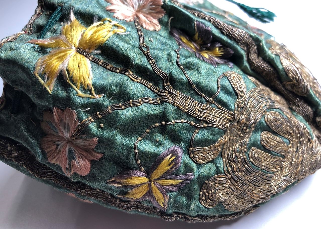 THE PURSE IS PLENTY PRETTY on the outside: emerald silk, embroidered with dainty yellow, purple, and peachy-pink blooms, arcing out of metallic vases. But things get more interesting when one pries the lustrous little parcel open.