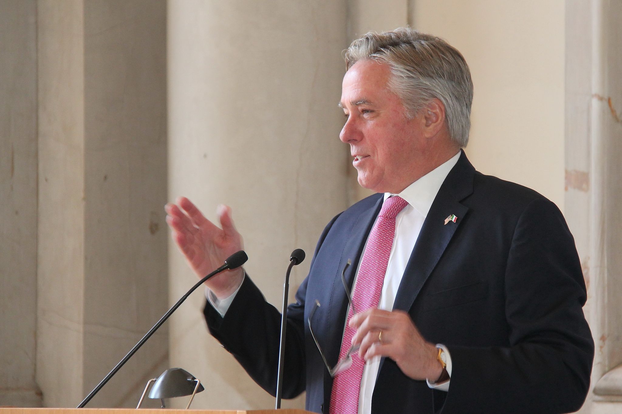 L'Ambasciatore Valensise ha parlato della duratura e consolidata alleanza tra Stati Uniti e Italia, citando in particolare la continua collaborazione in campo economico ed una visione strategica comune in merito alle sfide in campo nazionale e globale quali il terrorismo, l'ambiente ed il fabbisogno energetico.
