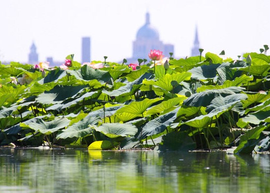 The lotus, Nelumbium nucifera, rise up from the water with large leaves and stunning flowers in shades of pale pink and white. These unique plants have adapted to grow in watery environments like lakes and slow-moving rivers. They root in the soil of the lakebed, and push out leaves that float on or above the surface.