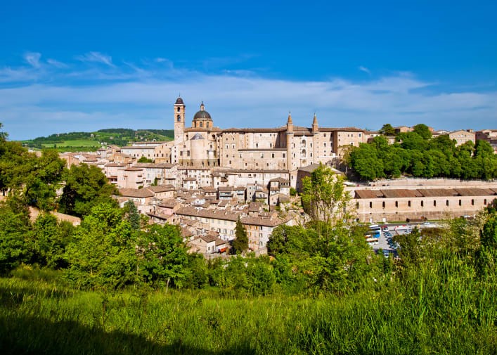 Undulating hills rise to volcano-like peaks on which towns perch. The ragged Apennine mountains stalk the horizon, and what's thought to be the Metauro river swirls below.