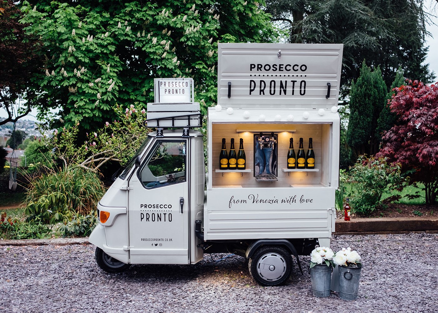 Hosts have the option to serve bubbly from an Italian motorbike-and-sidecar or vintage 3 wheeled Piaggio van. The prosecco served is from the DOCG region, just north of Venice. The prosecco van includes a staff and a barrel of bubbly which is about 150 glasses.