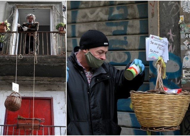 Angelo Picone lowers a wicker basket full of food to the ground on a rope, leaning over his rustic balcony, verdant with pot plants.“If you can, put something in. If you can’t, take something out,” Picone, a Naples street artist, merrily hollers to bemused passersby in the alleyway below.