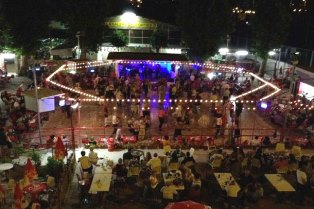 We eat among the locals on crude benches, wild boar, fried seafood, unsalted bread and strong San Giovanni red wine from an unmarked bottle. Then down to the dance floor where the children can run and jump and hide among the trees, we let them off and watch the locals do their thing.