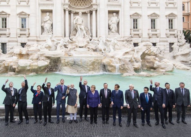 Italian prime minister Mario Draghi led the group, which did not include all of the G20 leaders, notably US president Joe Biden. The atmosphere was relaxed as the G20 heads each tossed a €1 coin, with outgoing German chancellor Angela Merkel rinsing her hands in the fountain's waters afterwards. The coins were minted specially for the occasion and feature Leonardo da Vinci's Vitruvian Man, the symbol of Italy's G20 Summit.