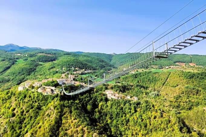 It takes the intrepid visitor between half an hour and 45 minutes to walk across the suspension bridge which links the villages of Sellano and Montesanto. The website points out that the ponte tibetano has a gap between each step, "which increases the adrenaline rush", and that crossing the stucture requires "a great deal of courage and sense of adventure".