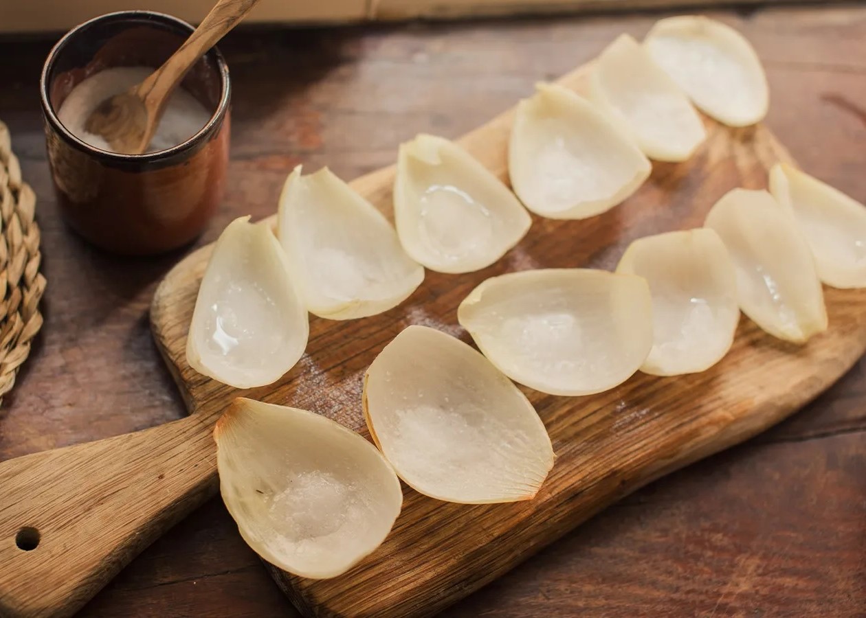 Sprinkling each piece with a generous pinch of salt, she leaves the board on her windowsill, facing east, and goes to bed. As the first rays of sun appear on the 25th, with her notebook and pen in hand, she interprets each sacred slice, looking for signs supposedly sent by a saint in the salt's reaction with the onion – are the wedges wet or dry, the salt caked or dissolved?