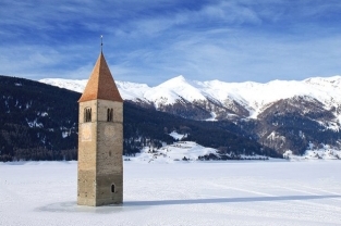 In Italy's Lake Resia, near the borders of Austria and Switzerland, a lone bell tower shoots up from the perfect, blue-green water. It's the only visible remnant of Graun (Curon in Italian), a town that vanished underwater more than 60 years ago.
