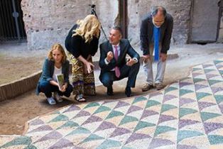 The cloak of time that concealed them – not to mention the green grass that covered them – is gone at last, and the precious polychrome "fan-shaped" mosaics in [one of the] palaestrae of the Baths of Caracalla (Rome), dating back to the third century AD, have resumed their ancient luster thanks to the restoration work begun in 2015.