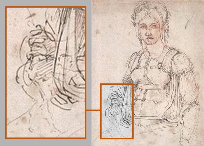 The small outline of a man hunched over a painting can be seen if you carefully scan the ink lines of the folds in the noblewoman's dress, around the abdomen area, de Campo says. The expert says the man's shape resembles a self-caricature the artist sketched in 1509 on the side of a sonnet dedicated to his friend and fellow artist Giovanni da Pistoia