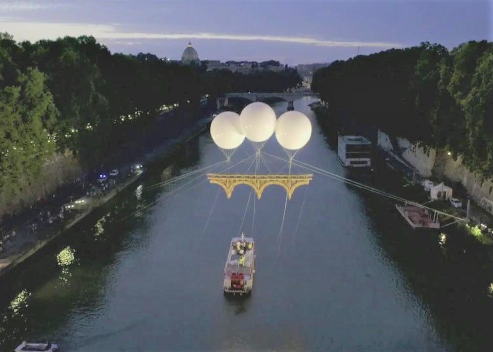 Michelangelo Buonarroti's dream of a bridge linking Palazzo Farnese with Villa Farnesina will finally be realised thanks to a project by French artist Olivier Grossetête. Made from cardboard, the 'Ponte Farnese' will be suspended over Rome's Tiber with three large helium balloons, connecting the French embassy with Villa Farnesina on the other side of the river in Trastevere.