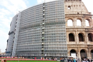The Colosseum under scaffolding. The Trevi fountain under scaffolding. Piazza di Spagna, the pyramid of G. Cestius, and other monumental sites under scaffolding.