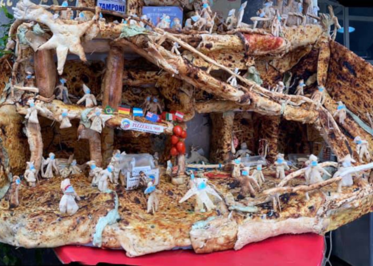 Un presepe in piena regola, con tutti i personaggi e la stella cometa, tutto fatto di pasta per la pizza, in modo da riunire due grandi tradizioni del territorio. Quest’anno la realizzazione del presepe di pizza si è anche adeguata alla pandemia che stiamo vivendo: tutti, infatti, nel presepe di pizza del 2020, indossano la mascherina, dai pastorelli ai re Magi.