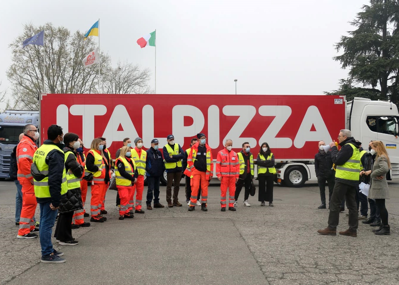 Ten vehicles, including the first Italpizza truck carrying frozen pizzas, campers, an ambulance, a van and a truck loaded with equipment. The volunteers are workers from Italpizza and its partner companies, volunteers from the Blue Cross of Modena and the Green Cross of Pavullo, with 15 ovens in tow to cook the pizzas for the refugees.