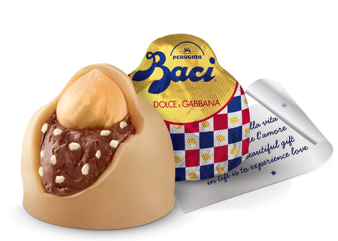 Baci Perugina announced the collaboration with Dolce & Gabbana as a celebration of Italian excellence. The new praline, called Dolce Vita, has been created by master chocolatiers working with Dolce & Gabbana. Perugina describes the result as a soft gianduia heart, with fresh lemon-flavored grains, and the crunchy whole hazelnut, all wrapped in sublime white chocolate with hints of vanilla. Dolce Vita is a “journey into the codes, scents, and colors of the Italian soul”.