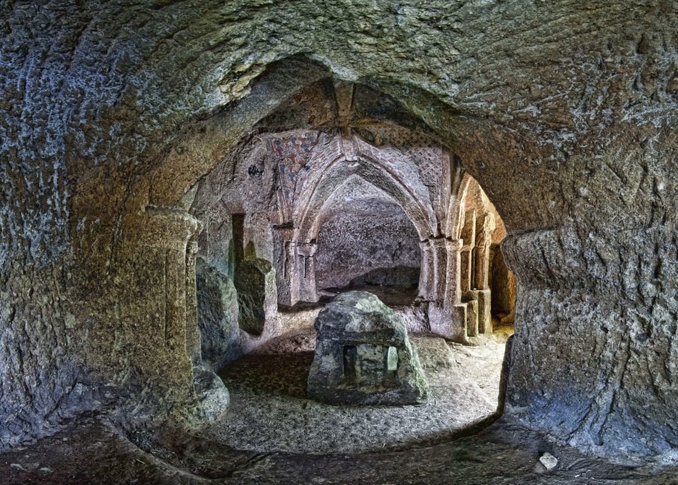 The hermits, who were inspired by the Gothic-Cistercian architecture of the time, dug a church and their living quarters in the local, malleable tuff stone at an ancient site that some believe was previously associated with the order of the Templar Knights. The interior of the chapel is adorned with certain symbols that are unusual for a Christian house of worship, suggesting they could have originated from the mysterious order.