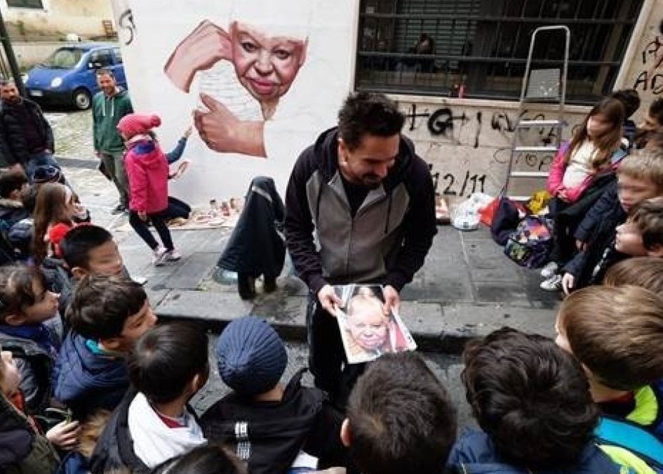 "Ua', ma tu la vedi a quella? È tale e quale alla signora bionda che sta in fondo alla strada". L'anziana donna che ha catturato l'attenzione dei bambini dei Quartieri spagnoli è Tarantina, uno degli ultimi femminielli della zona, oggi ottantenne, ritratto dal "madonnaro" di via Toledo, l'artista Vittorio Valiante sul muro di via Concezione a Montecalvario. Più avanti, in via Speranzella, un gruppo di ragazzini autistici e down del progetto Argo hanno realizzato un murale con il mondo capovolto, senza confini e con i porti aperti.
