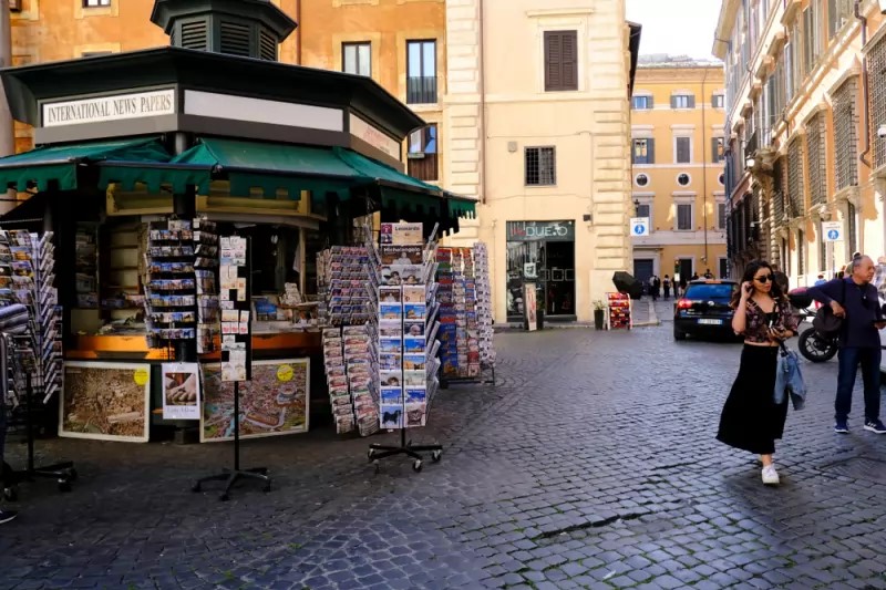 It’s 9:42 am, and I am sitting at Caffe Di Rienzo, a caffè latte in hand, with a perfect view of Emanuele’s newsstand, known in Rome as an Edicola. The surrounding neighborhood buildings cast a shadow over the forest-green walls of the small octagonal structure. The morning is quiet, interrupted only by the low hum of cars and scooters, the whispers of passersby, and the occasional honk of an impatient driver.