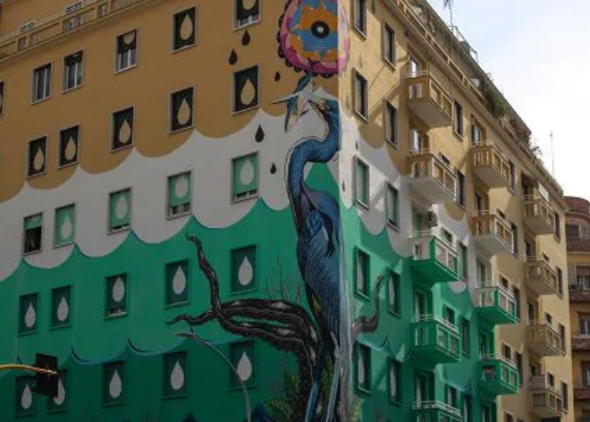 Nato da una idea di Yourban2030, no-profit al femminile guidata da Veronica De Angelis, il murales - che copre completamente un edificio - è stato realizzato utilizzando la tecnologia Airlite, una pittura mangia-smog. Si tratta del più vasto murales d'Europa a utilizzare questa tecnica, la più grande opera, è stato spiegato, "di street art rigenerativa" del continente. 'Hunting pollution' rappresenta un airone tricolore,specie in estinzione, in lotta per la sopravvivenza. L'uccello cattura la sua preda in un mare gravemente compromesso, ma contribuisce lui stesso a 'cacciare' l'inquinamento da uno degli incroci più trafficati della città.