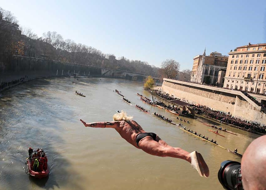 Not many know that, since 1946, Rome celebrates the new year in an unusual way: a dive from Ponte Cavour at midday, just when the cannons from the Gianicolo ring the hour. The first to celebrate the new year in an embrace with the icy waters of the Tiber was Rick de Sonay, a Belgian man of Italian descent, who would rigorously dive wearing a top hat. He was known as “Mister OK,” because he had the habit to make that gesture after emerging from the river, to reassure bystanders he was doing just fine.