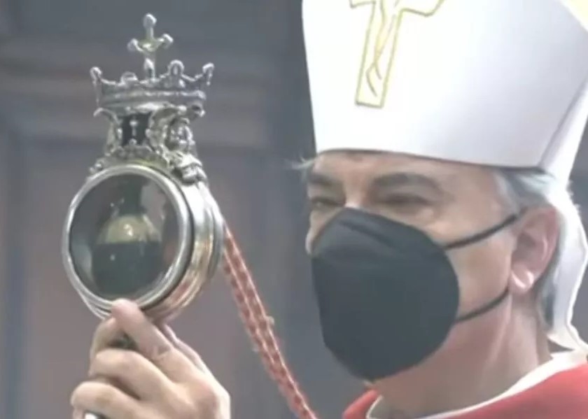 Archbishop Battaglia opened the safe containing a reliquary with a circular sealed vial filled with the third-century bishop’s blood. The 58-year-old archbishop brought the reliquary to the cathedral’s high altar. During the miracle, the dried, red-colored mass confined to one side of the reliquary becomes blood that covers the entire glass. In local lore, the failure of the blood to liquefy signals war, famine, disease, or other disaster.