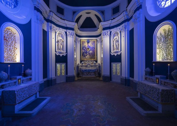 This work of art by a contemporary artist in an 18th-century chapel completely reinterprets the space, from the stained glass windows to the ceiling decorated with porcelain stars, to the decorated niches and porcelain creation, and was inspired by the Bosco of Capodimonte. Calatrava produced exclusive designs for the entire chapel from its lighting to its decoration to its furnishings.