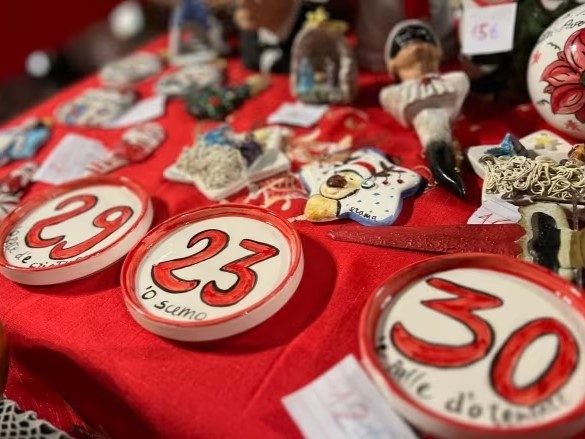 On a small stage, a towering figure in a cascading curly wig and silver sequined top, who goes by the name Lady Taboo, calls out images and their corresponding numbers: "Laughter, 19. Death that talks, 48. The hunchback, 53." As the images get called out, players cross off numbers on their cards, while Lady Taboo cracks jokes and teases the crowd in a Neapolitan slang so fast-paced it's hard for non-locals who speak Italian to follow.