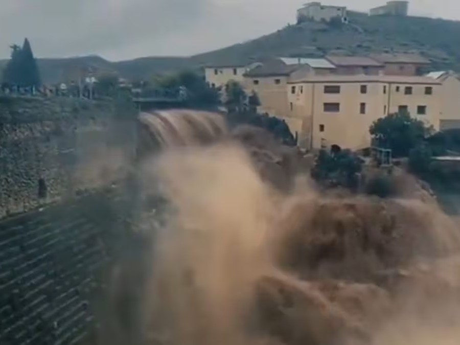 As anger grows in Spain over authorities' poor response to floods that have claimed more than 200 lives, footage has emerged showing how one town escaped the worst of the devastation thanks to a 2,000-year-old Roman dam, 134 meters high and 120 meters long. The video shows torrents of water crashing down on a hillside in northeastern Spain.