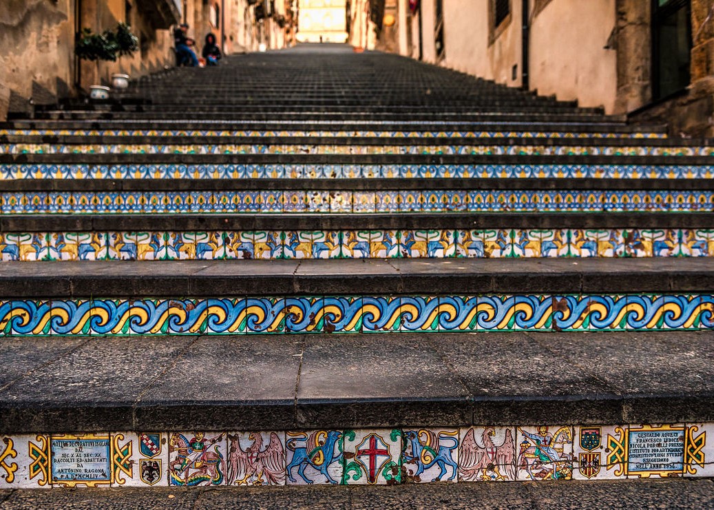 In the baroque town of Caltagirone, Sicily, the main attraction is its ceramics industry. The name of the town derives from the Arabic word qal’at-al-ghiran, meaning Castle of Vases. There are ceramics everywhere you look: tile murals on buildings, as signs, and in the many ceramics shops just waiting for a savvy voyager to select a few special pieces to take back home.