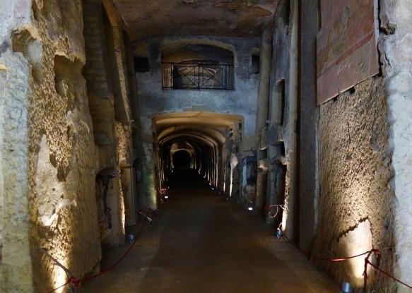 While this wild mess ensues at the beach, a restive calm incongruously lurks about 50 meters below ground in the 3,000-year-old city of Naples. Subterranean temperatures average 22 degrees centigrade and your balmy companions are the dearly departed saints and sinners of Naples from the past several millennia. 14,000 years ago a nearby phlegrean volcanic eruption dramatically altered the continental shelf of Europe, also covering the region that now constitutes Naples in several meters of ash.This ash later became the malleable rock, a sort of yellow tuff, ideal for constructing aqueducts, tunnels and catacombs.