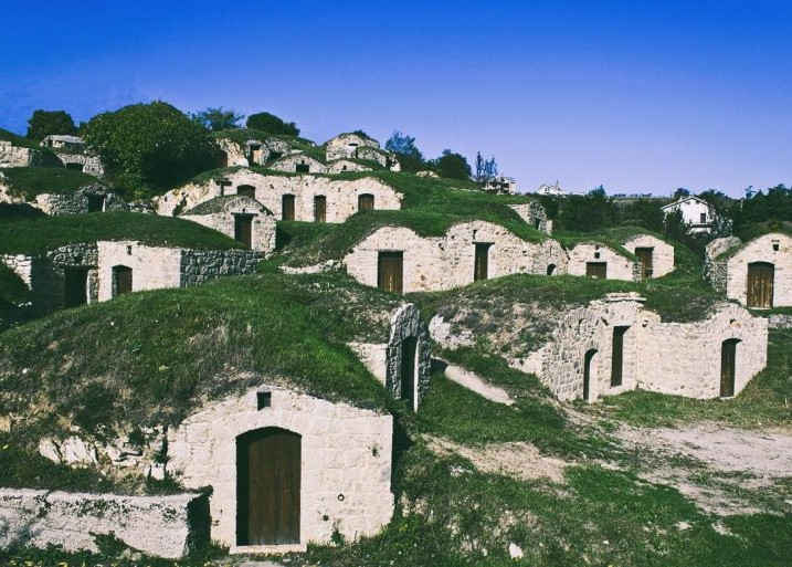 Tiny, whimsical white stone houses pop out of the earth like mushrooms. They look like hobbit homes, built into the earth and covered by grass and soil, and with no other adornment besides a simple wooden door. These are the palmenti, the charming stone structures that were once wine cellars for the local Pietragallese of centuries past.