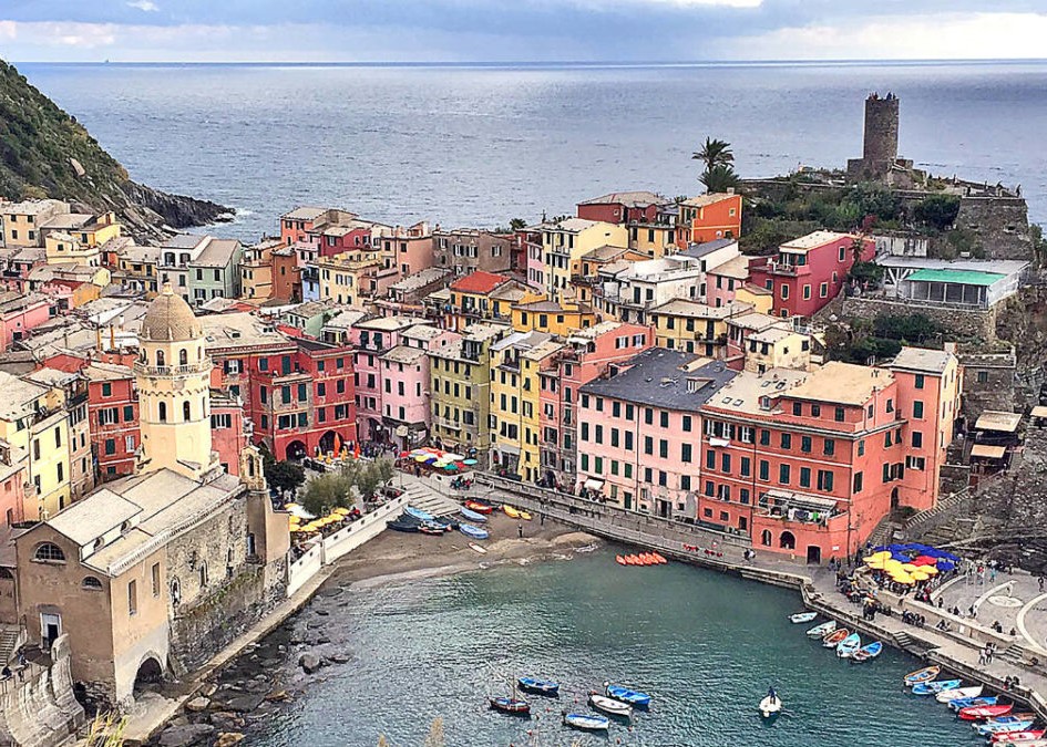 Vernazza’s strollable breakwater creates a little harbor, rare on this rugged Italian Riviera coastline. Grabbing a comfortable hollow in a boulder on the tip, I study the arrangement man and nature have carved out here over the last 1,000 years. Crumpled hills come with topographical lines: a terraced, green bouquet of cactus, grapevines and olive trees.