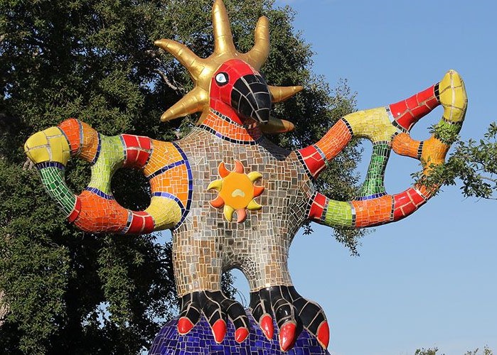 We are in the Tuscan Maremma, near Capalbio. Even from a distance, a spot of bright colors can be glimpsed on the hill, where the sculptor Niki de Saint Phalle in 1979 began the works that lasted almost twenty years, for the creation of the artist's park inspired by the game of Tarot.
