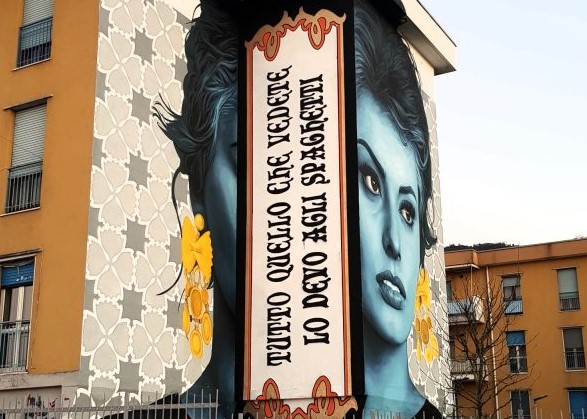 A vederla di fronte questa grande e bella opera dell’artista internazionale Leticia Mandragola sembra solo celebrare la bellezza della Loren ma, come si vede dalle belle foto di Angelo Russo, appena ci si sposta di lato si vede una grande scritta che dice testualmente” Tutto quello che vedete lo devo agli spaghetti”.