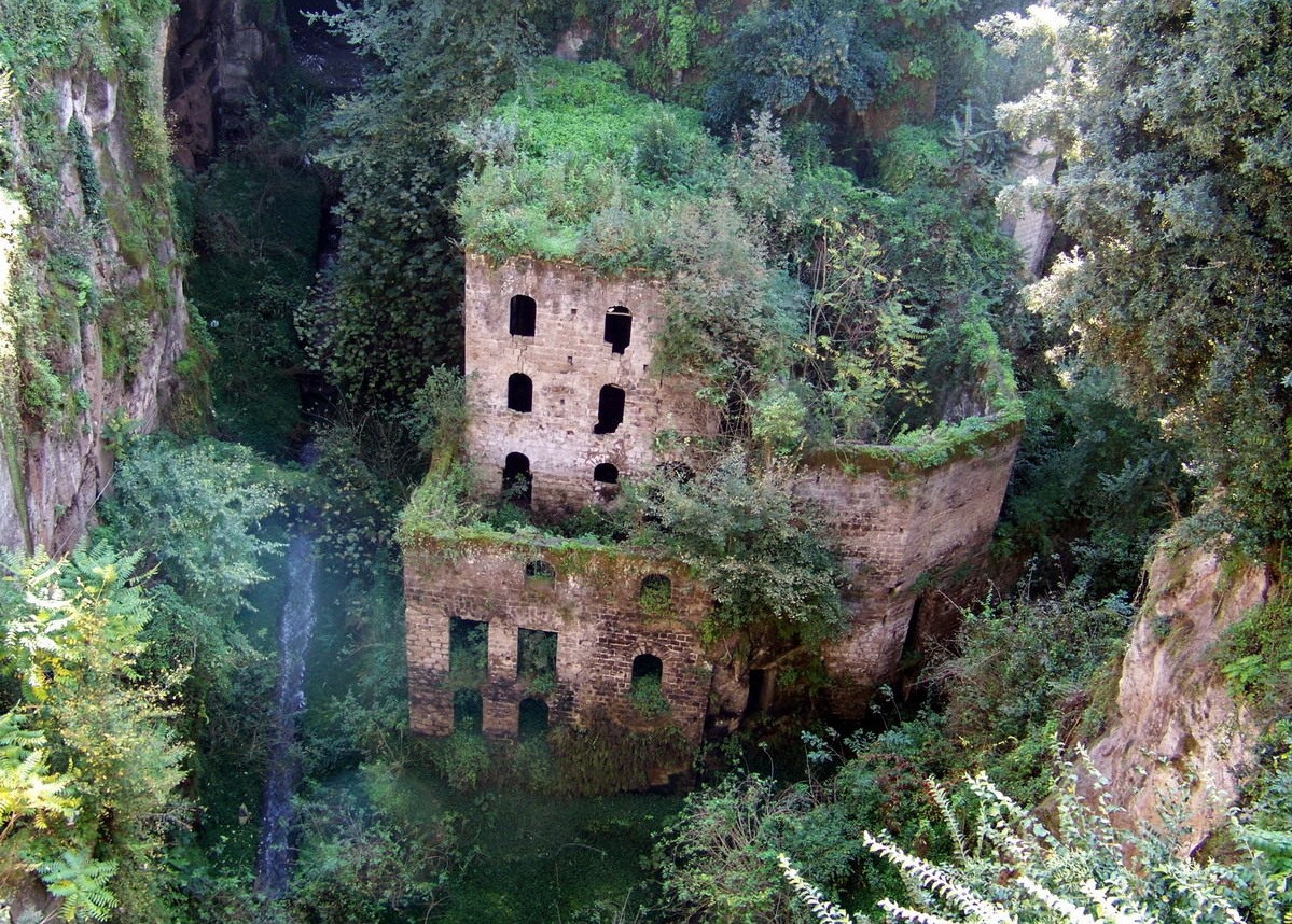 The deep crack in the rock which houses the crumbling buildings originated during a huge eruption which devastated the Mediterranean area 35.000 years ago. The flour mills, built from stone as far back as the 13th century, took advantage of the constant stream at the bottom of the valley. They ground all the types of wheat needed by the Sorrentine people in the surrounding area.