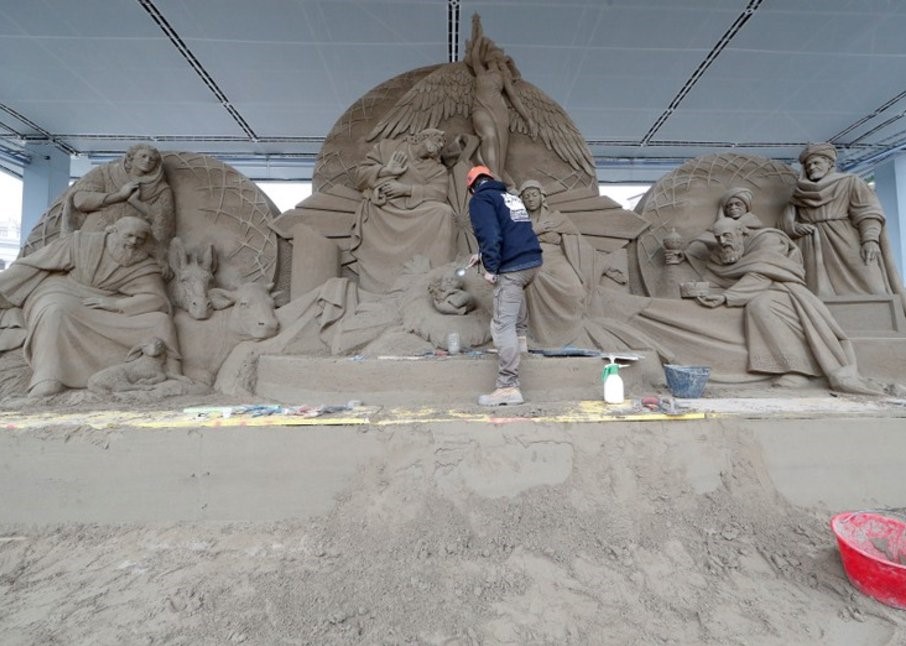 The traditional nativity scene in St. Peter's Square won't be so traditional this year. For the first time, it is made of sand - 720 tons of it. For the past two weeks, Rich Varano, a professional sand artist, has been guiding three sculptors from the Netherlands, Russia and the Czech Republic, to craft the work, which measures about 5.5 meters high by 16 meters wide (18 feet high by 52 feet wide).