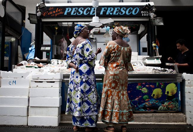 "Ciao, capo!" a South Asian vendor shouted to a colleague in colloquial Italian, meaning "Hey, boss." Nearby, two Indian nuns, wearing white robes lined with blue, inspected some produce. An African woman chatted on her cellphone, carrying a small child in a colorful sling on her back.