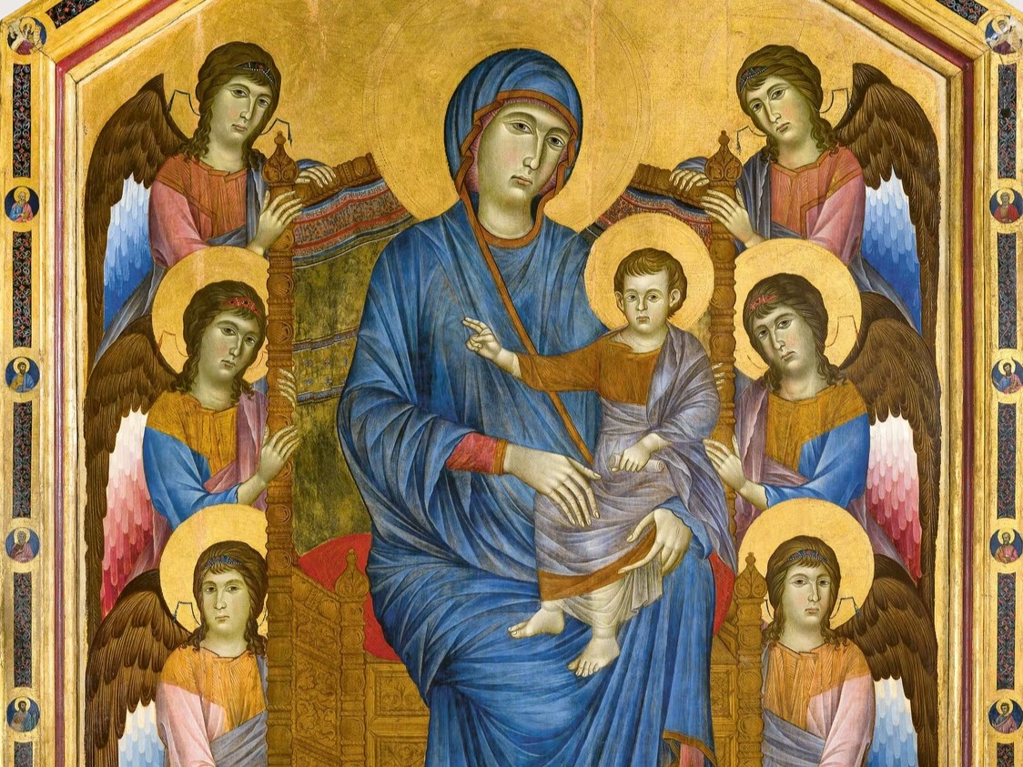 La Maestà, more than four metres high, depicts an enthroned Madonna and Child surrounded by angels, with apostles, saints and other figures represented in the original frame. It was first mentioned by the artist and chronicler Giorgio Vasari in his Lives of the Artists, and arrived at the Louvre in 1813, having been looted from Italy by Napoleon’s troops.