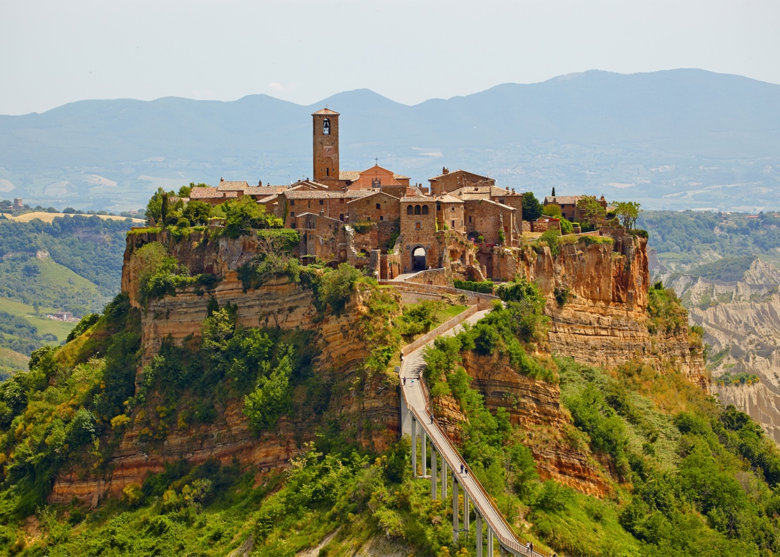 THE FIRST THING that must be said about the ancient town of Civita di Bagnoregio, just two hours away from Rome and Florence, is that it is beautiful. From a distance, it looks literally otherworldly: The town sits so high atop a perilously steep pinnacle of eroding volcanic rock that it seems as if it’s perched upon clouds rather than tethered to the earth. Its very sediment is strafed with 2,500 years of architectural history: Etruscan caves, ancient remains, medieval dwellings and Renaissance villas.