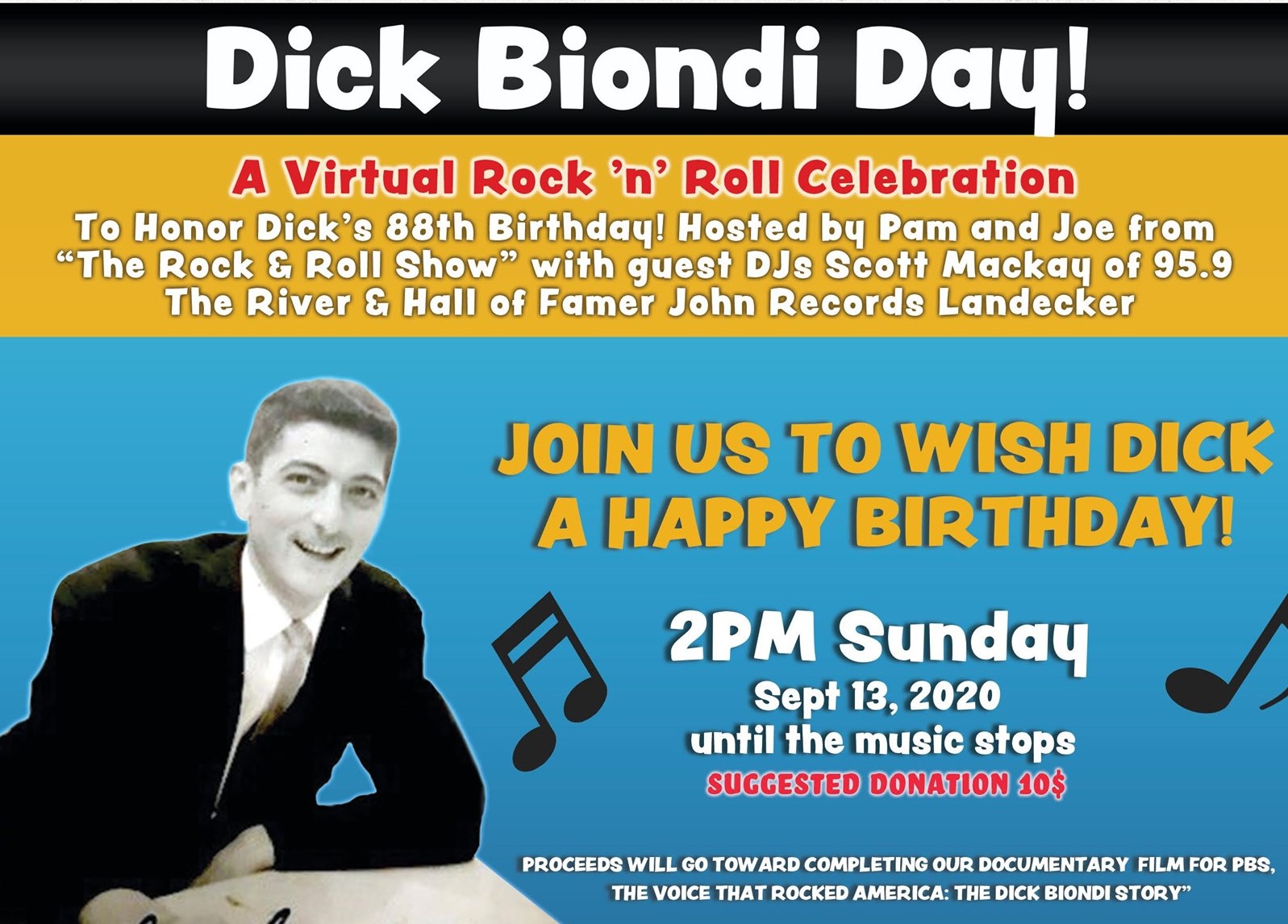 Sunday September 13 2020, from 2 pm to 6 pm CDT. Donate Here! Join us for the virtual Dick Biondi Day Birthday Celebration and Fundraiser! The New Colony Six headlines this spectacular event! Scott MacKay of The River and John Records Landecker will join us during hours 2 & 3. The event can be viewed via this link: https://www.facebook.com/TheDickBiondiFilm/