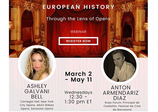 Instructors Ashley Galvani Bell (Carnegie Hall, New York City Opera, Sarasota Opera) and Anton Armendariz Diaz (Rioja Forum, Principal de Castellón, Festival de Cine de Barcelona) come from a background of operatic performance and directing, and their passion is likely to ignite yours. Choose one or all classes. Registration fee: $25 per class.