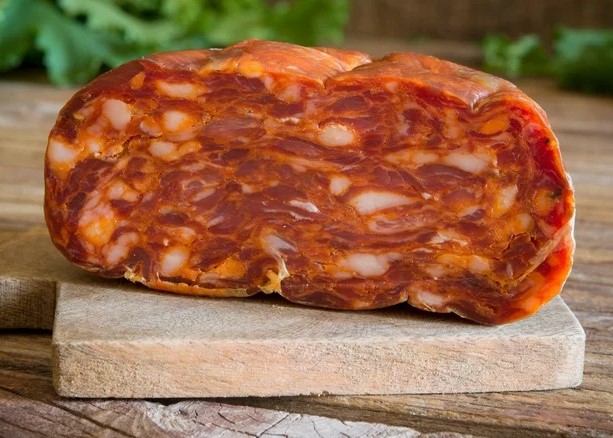But first, what is soppressata? According to Il Porcellino Salumi, it's a type of salami made from lean cuts of pork, which can include the shoulder, loin, and ham scraps mixed with lard to give it a marbled look and soft texture. The spices added to the pork vary regionally, but they are often some variation of salt, pepper, cinnamon, chili pepper, and rosemary.