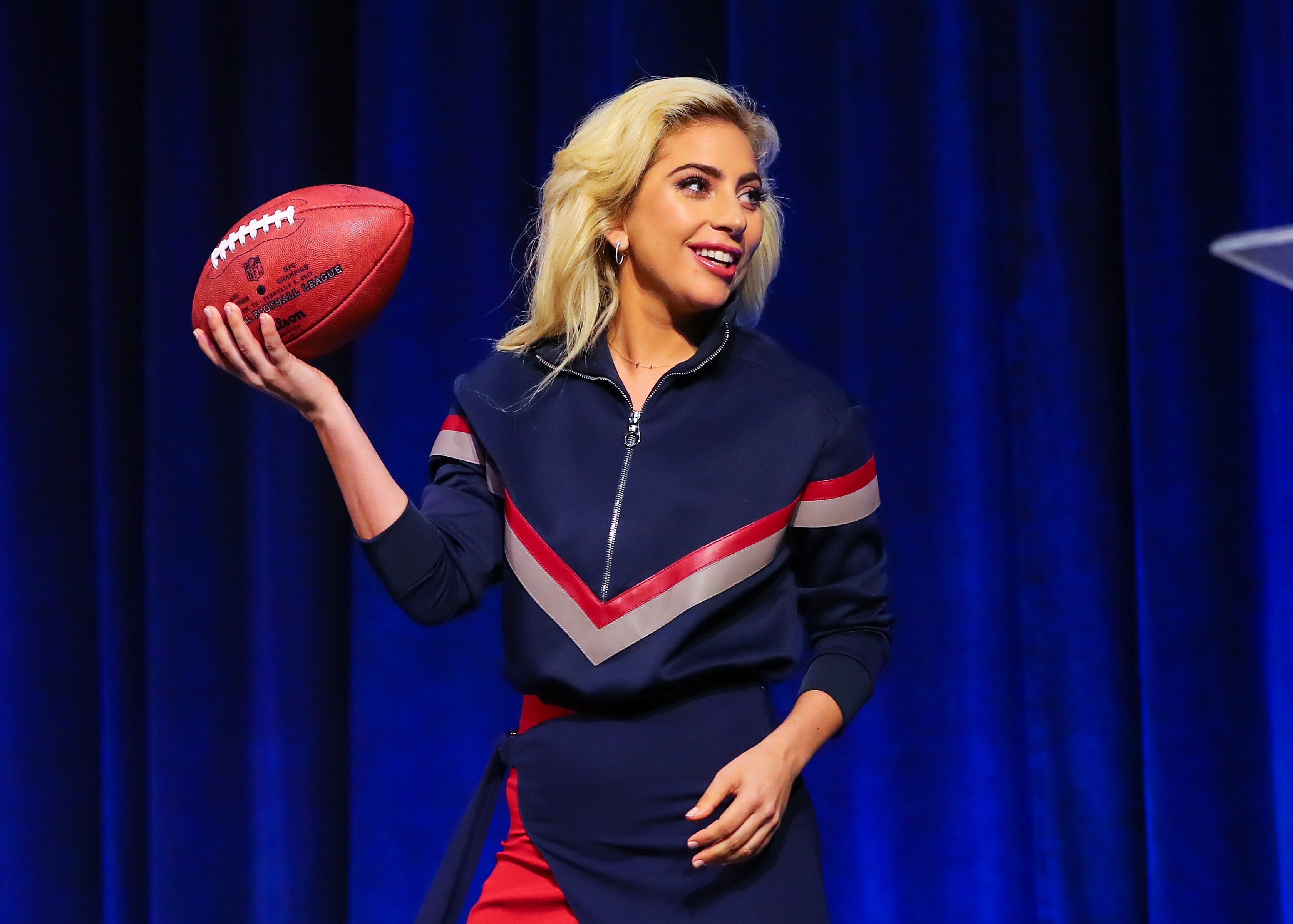 It makes sense for Lady Gaga to be wearing lots of patriotic sports-themed apparel, like her football purse, in the days leading up to her performance at what might be the most American sporting event of the year, the Super Bowl. Which appears to be why she chose to where a red, white and blue trendy track ensemble at Thursday’s Pepsi Zero Sugar Super Bowl LI Halftime Show Press Conference.