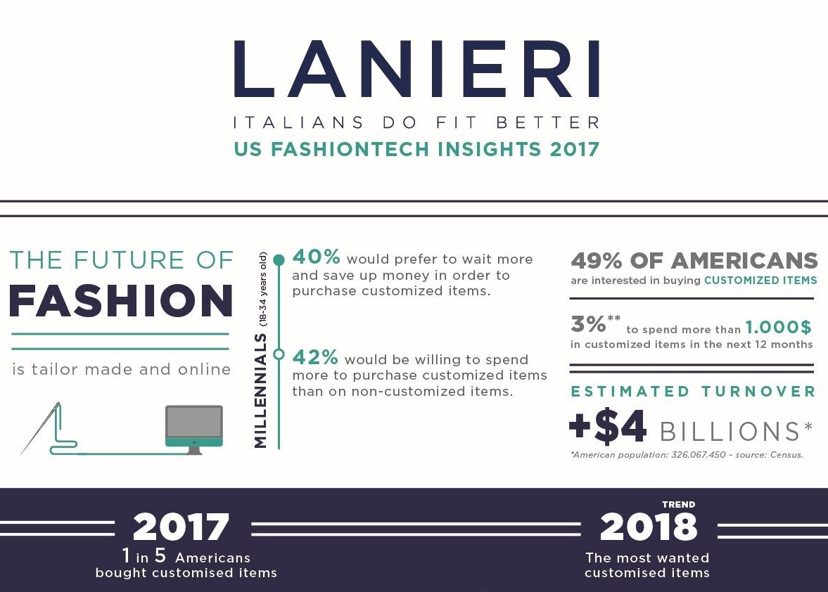 Lanieri US Fashiontech Insights - research conducted online by YouGov for made-to-measure fashion ecommerce Lanieri.com - shows half (49%) of US adults are interested in buying customized items. 3% of these Americans are likely to spend +1.000$ in made-to-measure products, with an estimated turnover of +4$ billions*.