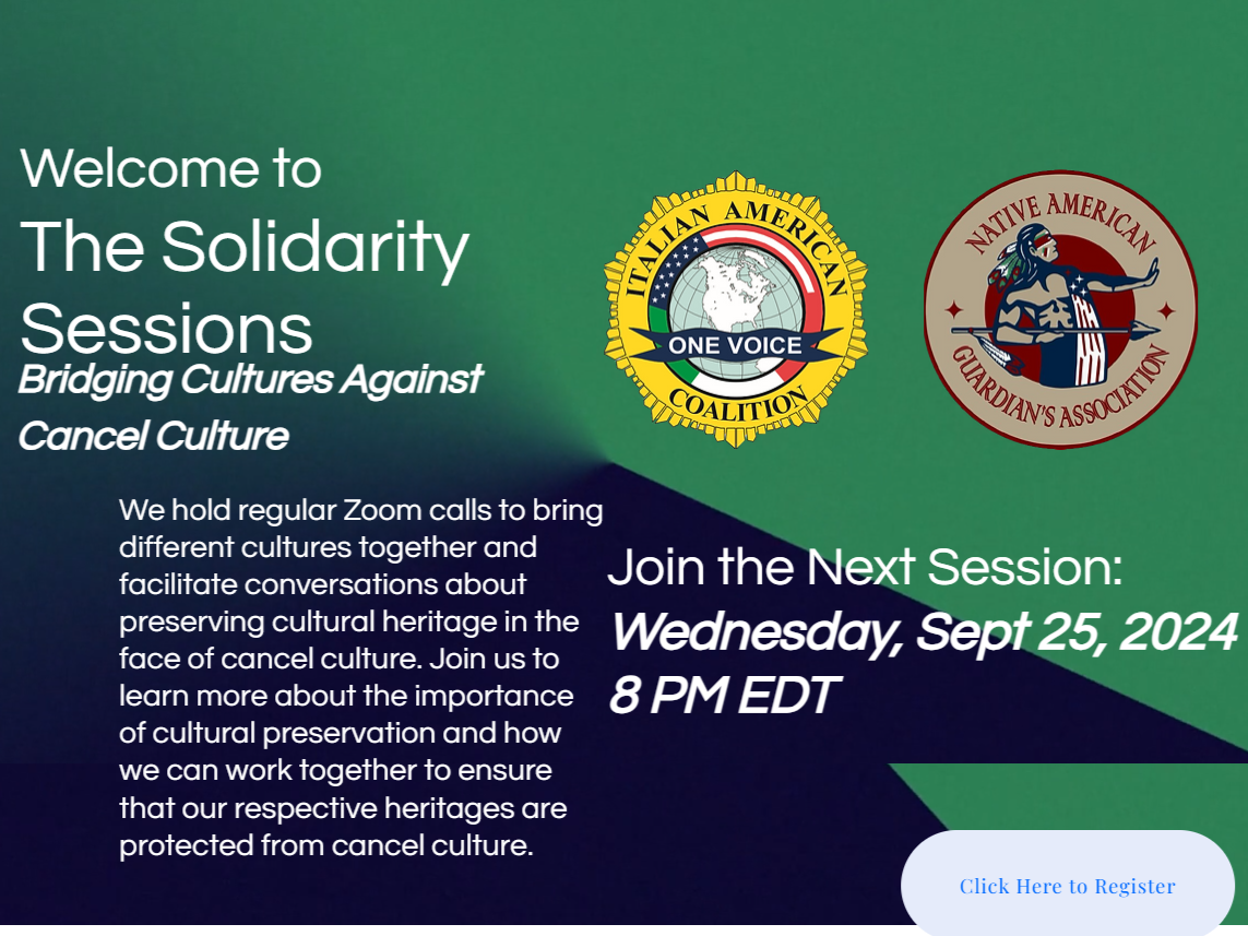 Leaders of the Native American Guardian’s Association (“NAGA”) and representatives of Italian American organizations from around the country invite you to join the next monthly Zoom meeting to collaborate in fostering understanding, promote dialogue and build solidarity among diverse groups facing challenges from cultural erasure and historical revisionism.
