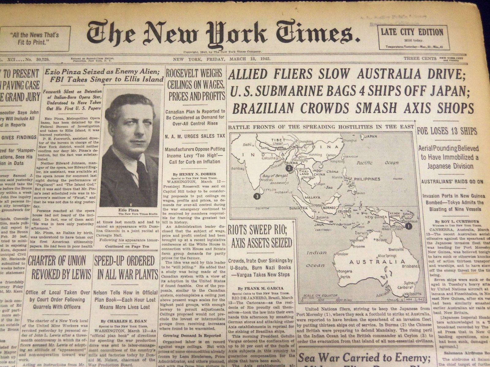 His lawyer, who during the first hearing had been with him but could not speak or anything, figured out what Pinza was suspected of. One of the terrible thing about this is that the people who were arrested and interned were what they called "Potentially Dangerous": they hadn’t done anything, and they were never told about what they were charged with, they were just told "You have to prove your innocence!" Innocent of what? How can I prove my innocence, when I don't even know what I'm charged with? Well, Ezio Pinza's lawyer was able to figure out what they suspected him of, and this is another anecdote. The Metropolitan Opera used to have a Saturday morning radio broadcast, and they suspected that Ezio Pinza in this Saturday morning radio broadcast would subtly alter the tempo of his singing to send secret messages to Mussolini! So the lawyer was able to shoot all of that down, and finally, after that second hearing, Pinza was released on parole. That's one of the things I love to tell people, because Ezio Pinza was a very big star: after the war he was asked to sing the Star Spangled Banner to the troops who came home and marched down 5th Avenue, and this is the guy who was arrested and almost interned!