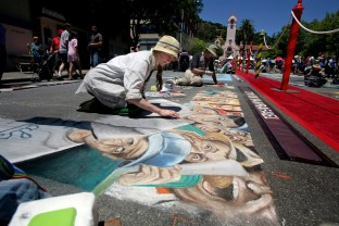 This year, founder and organizer Sue Carlomagno was all smiles as 22 artists participated in a down-sized street painting festival, working on colorful chalk images of California in the 1940s on a warm Saturday morning cooled by a gentle breeze.
