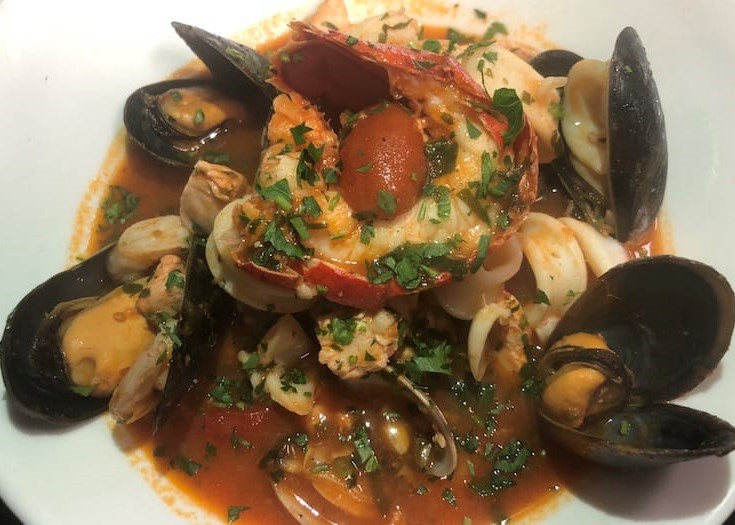 In the dining room, imported Italian, natural stone walls; reclaimed farmhouse wood on the floors and entryway ceiling; made-to-order comfy red chairs, and red and white linens on wood tables. Overhead: shiny, oversized air ducts give the restaurant an industrial feel below the piano-wire taut, pattern of steel cables crisscrossing the high ceilings. It’s a remarkable effect.
