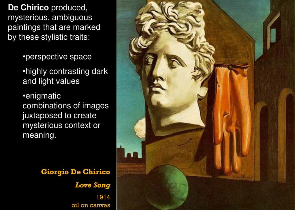 The Song of Love may sound like a piece of romantic Italian music, but in fact it is the title of a painting displayed at the Museum of Modern Art – MoMA — in New York, painted by the Italian painter Giorgio De Chirico in 1914. De Chirico was the leading representative of metaphysical painting, an art movement born in his soul and his imagination in the years just before the Great War (World War I).