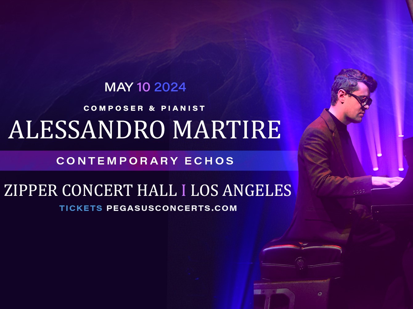 May 10, 2024. 8 pm. Zipper Concert Hall - 200 South Grand Avenue Los Angeles, CA 90012. Ticket Information here. Los Angeles, United States - Prepare to be mesmerized as internationally acclaimed pianist and composer Alessandro Martire makes his long-awaited debut in Los Angeles at Zipper Concert Hall on May 10th, 2024.