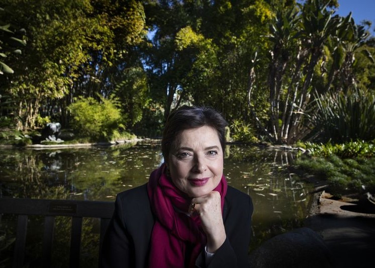 Isabella Rossellini stops in her tracks, her eyes fixed on a California scrub jay. Its feathers are deep azure blue, its belly a soft gray-brown. Perched on a security guard’s finger, it sits near the historic Japanese house at the Huntington Library, Art Collections, and Botanical Gardens in San Marino.